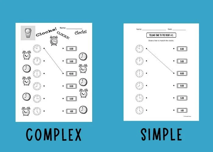 All worksheets do not need to be simple. However, when choosing curricula or practice pages for your students, think about the concept that you are teaching them. Some complex tasks are more understandable in a simple format. Other times, it may be better to have clipart or other embellishments to make the page look more fun and inviting. Consider your students and the topic, then choose the style that is right for you.